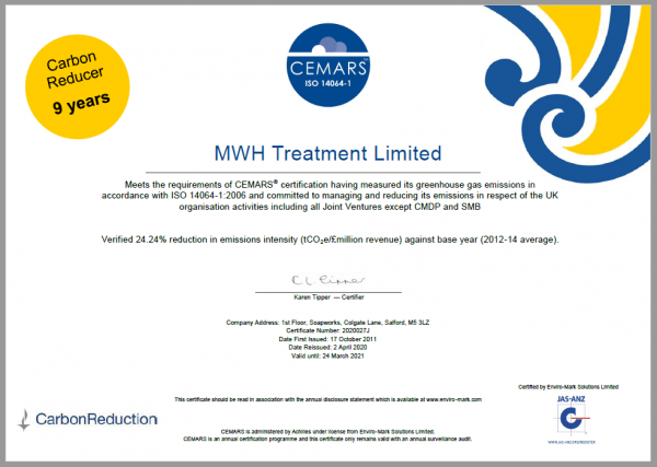 MWH Treatment have achieved a CEMARS Gold Certificate for our Carbon Footprint and have exceeded our target for reducing carbon emissions. We measure and report on our company carbon footprint annually, and for the last 5 years have been working towards a 12% carbon emissions intensity reduction.