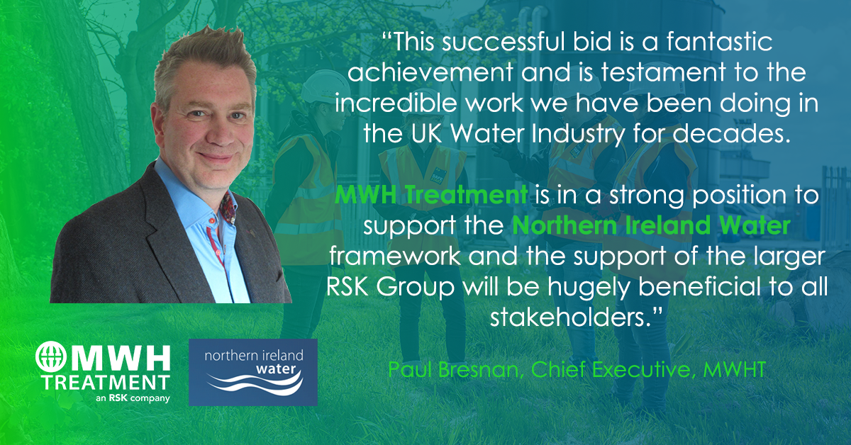 “This successful bid is a fantastic achievement and is testament to the incredible work we have been doing in the UK Water Industry for decades. MWH Treatment is in a strong position to support the Northern Ireland Water framework and the support of the larger RSK Group will be hugely beneficial to all stakeholders.” said Paul Bresnan, Chief Executive, MWHT.